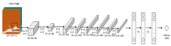 The Alex Net architecture in deep learning was utilized to classify the scalograms from the EMG signals. The input image resolution in this analysis was set to 227 × 227. Figure 8 shows the architecture of the Alex Net. The Alex Net consists of 5 convolutional layers, which consist of convolutional filters and 6 ReLU (rectified linear unit) activations with nonlinear activation characteristics. ReLU uses deep learning to speed up the convergence result from the training process []. Three max-pooling layers are used for the pooling layer.