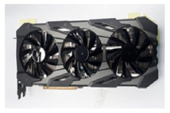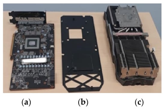 The evaluation was performed in the assembly station of a GPU company. The GPU produced is shown in Figure 9. It had dimensions of 24 cm × 13.2 cm and weighed 1185 g. The process of assembly involved combining three components, as shown in Figure 9: a base, a main board, and a fan. Five activities were needed to assemble the three parts shown in Figure 10, as follows: