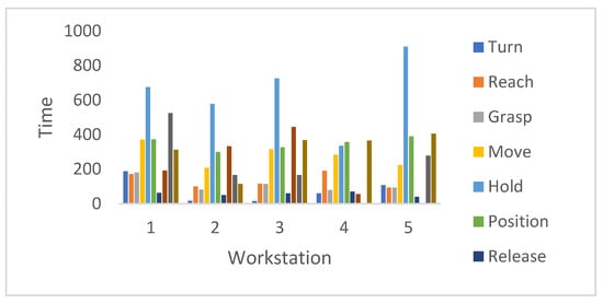 Work study is carried out to understand the characteristics of activities that have an impact on fatigue and can be allocated to robots. Methods–time measurement (MTM) can be used as the foundation for determining improvements in the operator’s work activities so that the movements used are efficient. Factors such as efficiency, quality, and safety must also be considered in designing collaborations between humans and machines [,]. Motion analysis can improve productivity by observing the stop locations of motions and detailing the motions in machine–human works []. Supporting the MTM analysis is another consideration from Gilbreth related to the identification of 18 movements of the human body, named Therbligs. Motion analysis based on Therbligs is efficient because of its cost-effective tool characteristics []. Other benefits of using Therbligs analysis are minimizing human error, achieving flexibility, and improving adaptability []. Therbligs can be applied broadly not only in the service industry but also in manufacturing. Therbligs can be complemented with other methods, such as value-stream mapping and energy supply modelling [,]. The results of motion analysis can provide information about the human status and thus inform the robot.