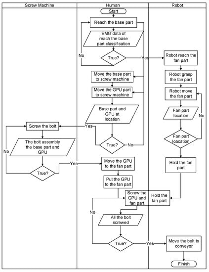 An understanding of the human characteristics during task performance can be attained from biofeedback from the human body. The human body provides much biofeedback, such as blood pressure, heart rate, skin conductance, and muscle activity []. Muscle activity analysis is adequate for depicting the human state in the characteristics of activities used in the collaboration. Muscle feedback will inform the system on how much humans use their muscles to carry out an activity. Muscle feedback provides signal patterns and intensity information about activities, which benefit the recognition process []. One device that is useful for analyzing human muscle activities is the electromyograph. A recognition process using electromyography (EMG) can predict the human intention in the collaboration and consider it as an indicator that can be sent to the robot. Based on this information, the robot can respond with a specific activity in the collaboration.
