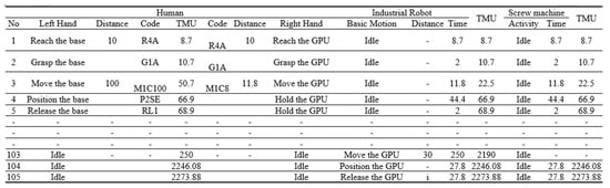 Table 3 shows that to finish this task, nine motions were needed. The proportion of ineffective motions was around 60%, and the hold position also made up the highest proportion of all motions performed by the operator. This position had a relatively high proportion compared to the others because the use of an automatic screwdriver required the operator to position some objects and tools. Despite the attachment to the main board, the object load here was still acceptable for a robot because the weight was less than 1 kg. Assigning this process to a robot would be possible because of the uniform conditions for screwing the bolt into the side part of the GPU. However, the position for attaching the part was on the side of the GPU. Hence, it would be difficult to set up the position due to complications in positioning the main board to support the screwing process (vertical position). Positioning the main board horizontally was possible, but it was difficult to change the automatic screwing position to the side position. For this reason, a human is better suited for the task. Regarding the motions performed by the operator to complete the task, the hold position could be assigned to the robot. The robot could hold the object while the operator completed the screwing process, and a chuck would be needed to establish a tight hold on the main board.