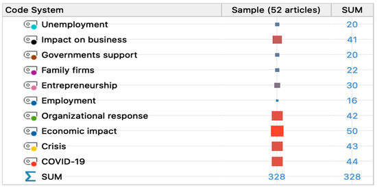 After an exhaustive analysis of the 52 documents, using MAXQDA, 10 emerging categories were determined, namely: Unemployment, Impact on companies, Government support, Family businesses, Entrepreneurship, Employment, Organizational response, Economic impact, Crisis and COVID-19. The categories were selected based on the criteria of the presence of strong themes (identical meaning units with a higher percentage of occupation in the papers under analysis), on their co-occurrence in global terms and on the empirical variations considered relevant. These categories were assigned 328 units of meaning, that is, a set of relevant text segments was distinguished, as they are considered the most representative of the categories previously established, resulting from the systematic review and mining of the content of the sample documents, thus originating, the results presented in this section. Figure 2 organizes and summarizes the core of the analysis made in this study, giving a first view of the impact of each emerging theme in the 52 documents.