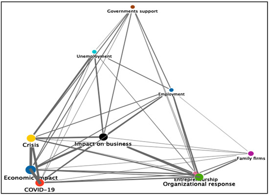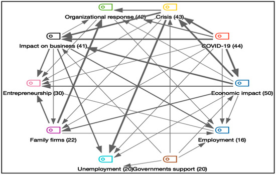 The greater co-occurrence between Crisis and Economic Impact (51), followed by COVID-19 and Economic Impact (43) and COVID-19 and Crisis (33). According to the same data, the link between Organizational response and the emerging themes of Entrepreneurship (27) and Family firms (24) can also be highlighted.