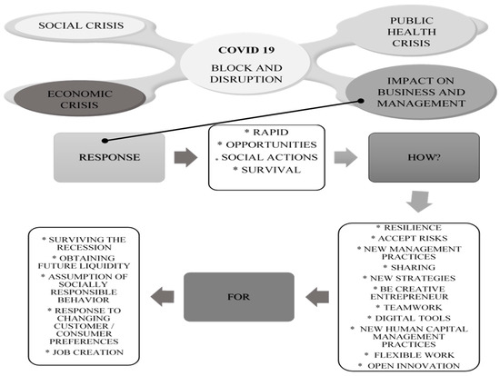 However, the lack of scientific knowledge about COVID-19 remains, particularly about how to manage the negative impacts on the economy caused by non-medical interventions [9], and so recovery from this crisis depends on how managers/business-people face up to it—as a threat or an opportunity—[8]. Previous research on crises has shown that countries, industries and firms have suffered significantly from the consequences of the global pandemic, due to the shock between supply and demand [8]. Previously, organizational crises and crisis management, and the associated constructs, were addressed by various authors [11,12,13]. Greiner [12] studied the relevant changes in the system and in parties regarding the crisis; Hills [14] investigated the time/moment of decision-making; Faulkner [15] studied the positive effects of crises in the field of innovation and identifying new markets; Elliott and McGuinness [16] highlighted the stakeholders involved in these processes and Coombs, Pfarrer et al. [17,18] the changes in the relations with these stakeholders in the post-crisis; Hale, Dulek and Hale [19] emphasized the financial and accounting perspectives and crisis management, while Baron, Harris and Elliott [20] underlined the importance of strategic responses to the crisis; Lampel et al., Veil [21,22] showed the effects of firms’ adaptation and learning and their liquidity in crisis situations; Brockner and Erika, Dane and Pratt [23,24] presented the crisis as an opportunity for more flexible work and open management. However, the lasting effects of COVID-19 on the economy depend on how the authorities, firms and families react to the changes caused by the disruption, and consequently, to the unavoidable recession, given that coronavirus has provoked a major fall in gross domestic product (GDP), the worst observed in the last 100 years [25]. Finally, a recent study found that it is essential to provide input on management methods to deal with the impacts of crises [26].