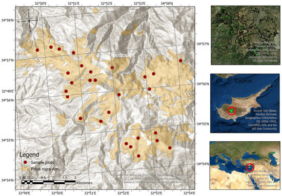 The Troodos Mountains study area and the spatial distribution of the sample plots.