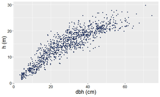 Scatterplot of the diameter (dbh) against height (h), Pinus nigra Arn. National Forest Park of Troodos, Cyprus.