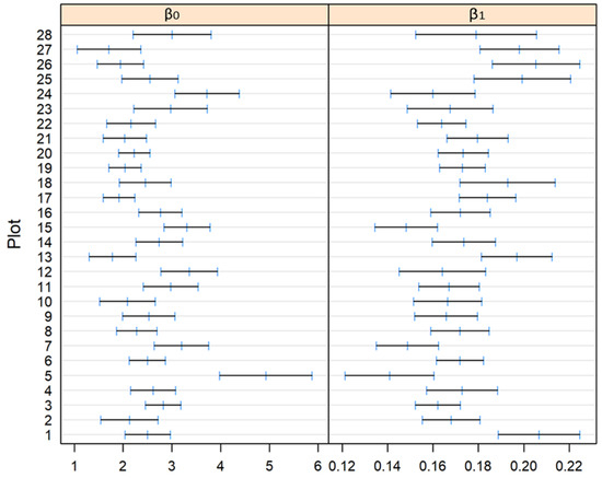 The 95% confidence intervals on the coefficients (β0,1) of the Näslund’s model (M1) fitted to the total number of sample plots, Pinus nigra Arn. National Forest Park of Troodos, Cyprus.