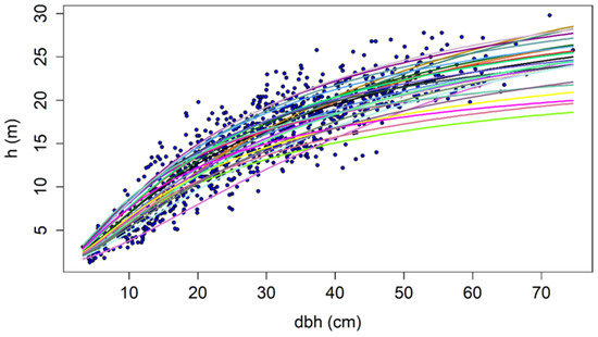 “Spaghetti” chart of the Näslund’s model (M1) fitting performance against the observations of the total sample, where h is the total height and dbh is the diameter at breast height, Pinus nigra Arn. National Forest Park of Troodos, Cyprus.