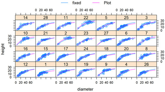 The total sample and the within-group predictions against the height–diameter observations per plot (Figure 5) further configure the good performance of the suggested model, since the within-group predictions are in close agreement with the observed concentrations.