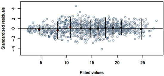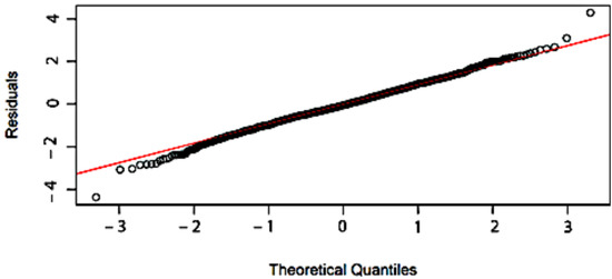 The residual and the Q–Q plot are presented in Figure 12 and Figure 13, respectively. From a visual inspection, no heteroscedastic trends were detected; neither was a significant deviation from the straight line observed.