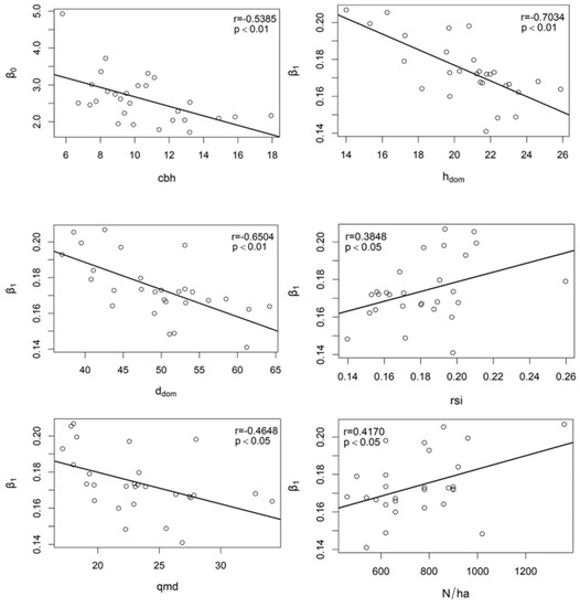 The β0 parameter was negatively correlated with cbh (r = −0.539, p < 0.01), whereas the β1 parameter was negatively correlated with hdom (r = −0.703, p < 0.01), ddom (r = −0.650, p < 0.01) and qmd (r = −0.465, p < 0.01), and positively correlated with rsi (r = 0.385, p < 0.05) and N/ha (r = 0.417, p < 0.05). However, the ccf did not correlate with any of the two parameters.