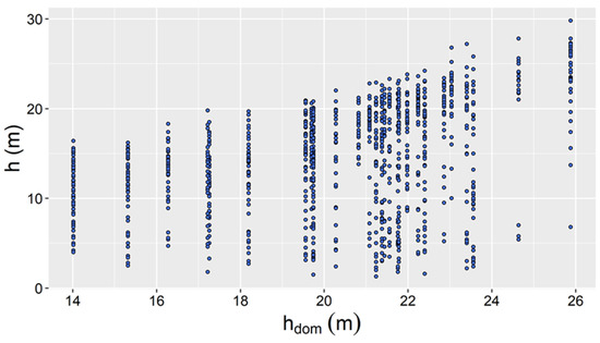 Scatterplot of the dominant height (hdom) against height (h), Pinus nigra Arn. National Forest Park of Troodos, Cyprus.