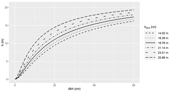 The Site Index (SI) reflects the combined effect of physical and ecological factors, which are expressed though the site’s ability to support tree growth [48]. It is closely linked with the hdom, since it is estimated from the mean height of the largest trees at a reference age [49]. The effect of hdom on the height expression of Black pine trees suggests that the height of trees with an equal height to crown base height, grown in similar competition conditions (dominant diameter) is larger in sites where the height of the dominant trees is higher (Figure 14). From an ecological perspective, this was expected, since dominant height also reflects the development stage of the stand (Figure 9). In this sense, the highest dominant height implies higher individual heights due to the older stand age [50]. On the other hand, a higher dominant height may be attributed to better site quality and, consequently, better growth conditions. The overall positive effect of hdom is consistent with the findings from other authors and it has been included in the height modeling procedure [30,51,52,53]. From an operational perspective, the inclusion of the hdom variable as a covariate for the development of generalized models is advantageous, because it can be easily estimated in the field by measuring only a few trees per stand [54].
