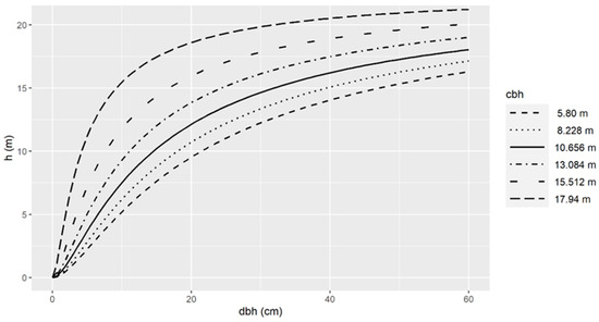 For the development of the generalized form, the correlated variables were introduced into the model and their effect was assessed using the significance of the associated parameter (approximate t-statistic). Furthermore, the number of the inherent variables was intently tested to avoid any overfitting that could possibly occur. The hdom and the ddom at the stand level, along with the cbh at the tree level, improved the model’s performance significantly and they are proposed as additional covariates for Black pine height predictions. Despite the fact that the cbh at the plot level was correlated with β0, the inclusion of cbh at the tree level provided more accurate predictions and it was retained. The other variables were not associated with a significant parameter within the model, and they were not included in its final form. The relationships of the response variable and the covariates in the final model are presented in Figure 9, Figure 10 and Figure 11 and the form of the generalized model (G1) is as follows: