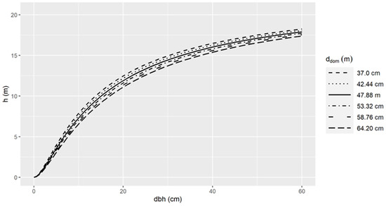 The ddom has the lowest effect on height allometry compared to the other two covariates (Figure 10 and Figure 16). Moreover, a negative impact on tree heights can be observed, which was expected, implying that the largest dominant trees in stands of the same development stage lead to lower individual tree heights. This outcome complies with the findings of Castredo-Dorado et al. [52] and Castaño-Santamaría et al. [55], who incorporated the effect of ddom into their proposed generalized models. This impact may be attributed to the effect of the competition status within the stand reflected through the ddom. Under this hypothesis, sparse stands lead to the thickest dominant trees in sites where lower tree heights occur due to lower competition levels within the stand. The competition level and the effect on tree heights have been already well established in forest science [52].