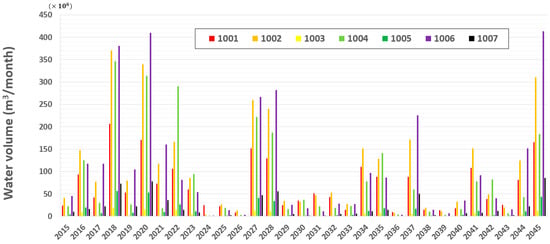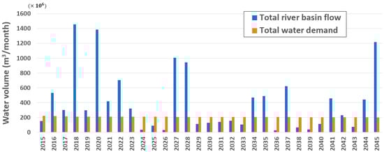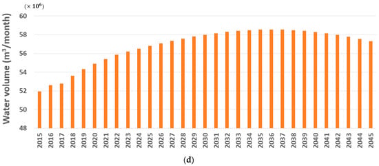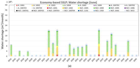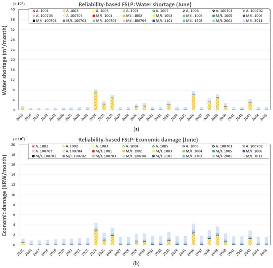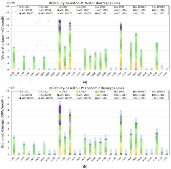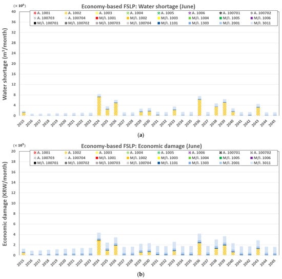 - The results of the economy-based SSLP allocation show a lower total water shortage because water allocation focused on municipal and industrial sectors and the use of reclaimed water increased; moreover, the priority of river maintenance flow demand was lowered. Over the next 30 years, average and maximum water shortages in June of 6.7 million m3/month and 21.5 million m3/month (2036), respectively, were obtained, corresponding to average and maximum economic damages of 3.8 billion KRW/month and 10.6 billion KRW/month (2024), respectively. Therefore, compared to the reliability-based SSLP method, in which the objective function of water allocation is simply based on the supply quantity, water allocation considering the economic value of the water reduces both the water shortage and economic loss to a certain degree.