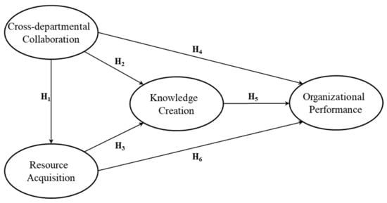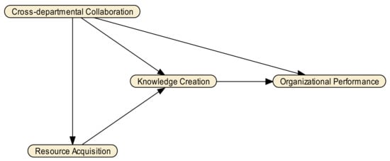 Nearly all previous empirical studies have examined the direct impact of cross-departmental collaboration on organizational performance [3,9,10,11]. However, there has been limited research that accounts for the indirect effects of cross-departmental collaboration through the role of managerial practices. This study enables the investigation of the causal pathways between resource acquisition and knowledge creation through which cross-departmental collaboration leads to organizational performance improvements. Resource acquisition is grounded on the resource dependence theory (RDT) and the resource-based view (RBV), which are well-established organizational theories. The RDT was adopted to empirically investigate mutual dependence between organizations, resulting in valuable insights and leveraging more understanding of the organization [12]. The RDT states that organizations opt to collaborate in exchange relationships due to the requirement for critical resources [13]. The RBV was used as a theoretical lens to understand resource acquisition mechanisms to sustain performance. The RBV highlights that an organization’s sustainable advantage is derived from the strategic resources that the organization possesses [14]. Nonaka’s theory was adopted to frame knowledge creation. From a process viewpoint, knowledge creation is defined as an organization’s ability to create new knowledge, transfer it within the organization, and incorporate it into products, services, and processes [15].
