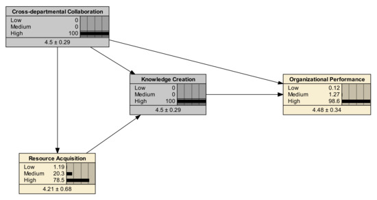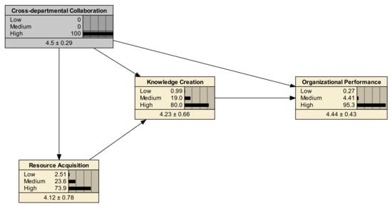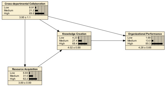 Using a deductive approach, structural equation modeling has been employed to empirically test the hypotheses because deductive reasoning establishes firm criteria for verifying hypotheses [40]. The standardized regression coefficients are presented in Table 3. Cross-departmental collaboration was considered an exogenous factor (γ), while the other remaining constructs were considered endogenous factors (β). The critical ratio (C.R.) is calculated by dividing a path parameter’s regression weight by its standard error. The C.R. is interpreted similarly to the Z-test, whereby the path with a C.R. greater than 3.29 is significant at the 0.001 level [54]. Cross-departmental collaboration exerted a strong and positive influence on resource acquisition (0.692, p < 0.001), supporting H1. Cross-departmental collaboration had a moderate and positive impact on knowledge creation (0.274, p < 0.001), thus H2 is supported. The association between resource acquisition and knowledge creation was strong and positive (0.576, p < 0.001), providing support for H3. Cross-departmental collaboration is positively related to organizational performance (0.111, p < 0.001), supporting H4. Knowledge creation exerted a highly positive impact on organizational performance (0.942, p < 0.001), accepting H5. Finally, the proposed path from resource acquisition to organizational performance was removed, which implies the rejection of H6.