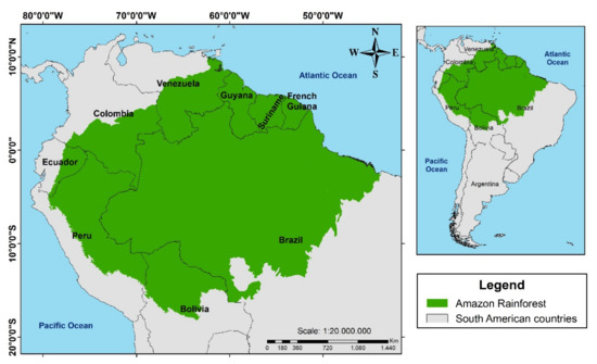 The Amazon region, located in the north of South America (Figure 1), is shared by nine countries, Bolivia, Brazil, Colombia, Ecuador, Guyana, French Guiana, Peru, Suriname, and Venezuela. It stands out for its biological diversity and for being the largest continuous tropical forest in the world. It offers goods and services to the ecosystem, such as pollination and cultural and landscape provisioning. It also captures carbon from the atmosphere, establishes the water balance in the Amazon river system, and intervenes in the climate and air chemistry [18,19,52].