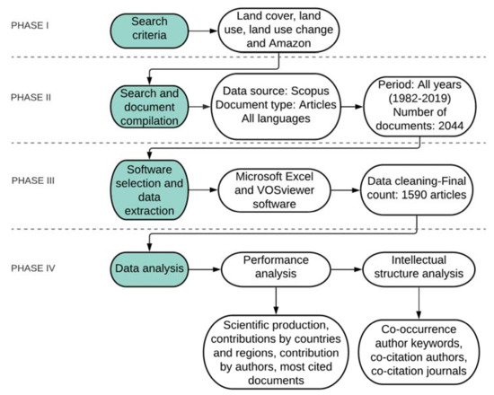 The search equation was defined as (TITLE-ABS-KEY (“land cover”) OR TITLE-ABS-KEY (“land use”) OR TITLE-ABS-KEY (“land use change”) AND TI-TLE-ABS-KEY (amazon)) AND (EXCLUDE (PUBYEAR, 2020)) AND (LIMIT-TO (DOC-TYPE, “ar”)) AND (EXCLUDE (LANGUAGE, “Undefined”)).