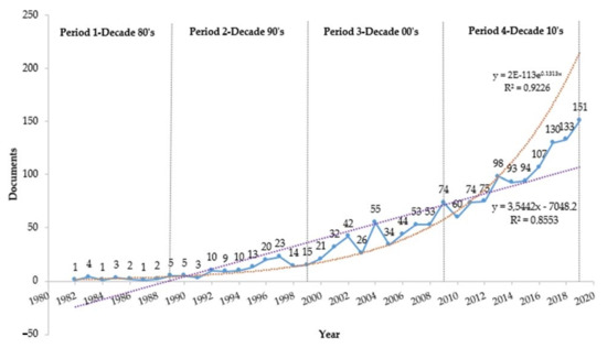 Figure 3 shows the distribution of the publications across time, starting from 1982 and divided by decades, according to the database. The intellectual structure presents 1590 articles, of which 1494 were cited, with a total of 57,305 citations. The first article was titled “Amazon Basin soils: management for continuous crop production”, published by Sanchez et al. [92] in the journal Science, cited 172 times. The search showcased a significant growth in scientific production starting in 1992. In addition, the last decade (2010–2019) seems to have relevant representation, with more than 60% of the production of academic literature.