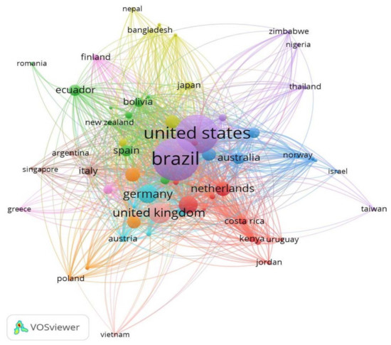 To have a better understanding of the collaboration that exists among each country, the VOSviewer software was used to obtain a network map, where each node represents a country. Figure 4 shows the collaboration network between countries. The network has 62 nodes or items, 10 clusters, and a link of 1375 with a total strength of 758,621. Brazil has a strong link with the United States (link strength 170,436), the United Kingdom (link strength 38,260), Germany (link strength 29,601), Canada (link strength 11,753), France (link strength 21531), the Netherlands (link strength 15,684), and Sweden (link strength 12,419), indicating a significant coauthorship between them. However, it should be noted that Brazil also presents authorship in conjunction with Asian countries such as China (link strength 3758); with Oceanian countries such as Australia (link strength 8723); with African countries such as Tanzania (link strength 226); and with other South American countries such as Colombia (link strength 7862), Peru (link strength 6710), and Ecuador (link strength 3959).