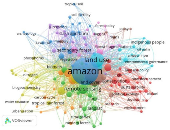 Cluster 2 (green), called ‘remote sensing’, comprises 21 nodes with 367 occurrences. The studies depicted in this cluster are related to the determination of the forest biomass distribution [149]; LULC classification [114]; space imaging spectroscopy [160]; plant carbon mapping [161]; and the geographic distributions of species (birds, mammals, and trees) [162]. The most recent studies are related to the mapping of forest and agricultural mosaics [163]; the use of optical satellite data and radar to the expansion of oil palm in the Peruvian Amazon [1]; and the spatial and temporal dynamics of LULC change of coverage through the use of software ENVI [164].
