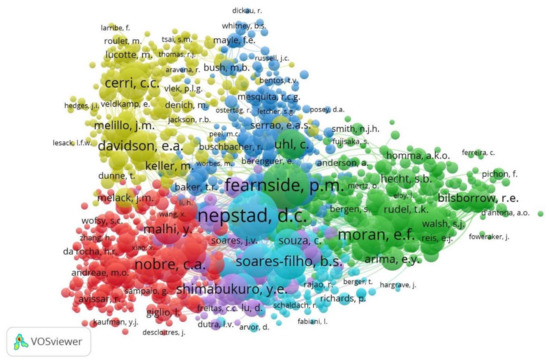 Cluster 1 (red), related to ‘deforestation-forest-climate’, was represented by 384 authors with 21,921 citations. The studies within this cluster are related to the carbon flux from deforestation, biomass, and climate variation. The researchers Nobre C.A., Malhi Y., Coe M.T. have been highlighted.