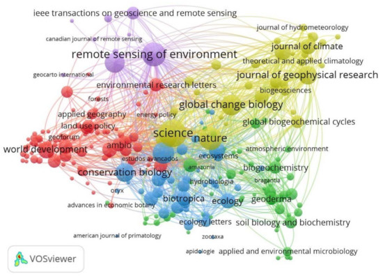 Cluster 2 (green), called ‘environment-soil’, was represented by 56 nodes with 5210 citations, in which the journals Acta Amazonica, Geoderma, Soil Biology and Biochemistry, Biogeochemistry, and Oecologia stand out.