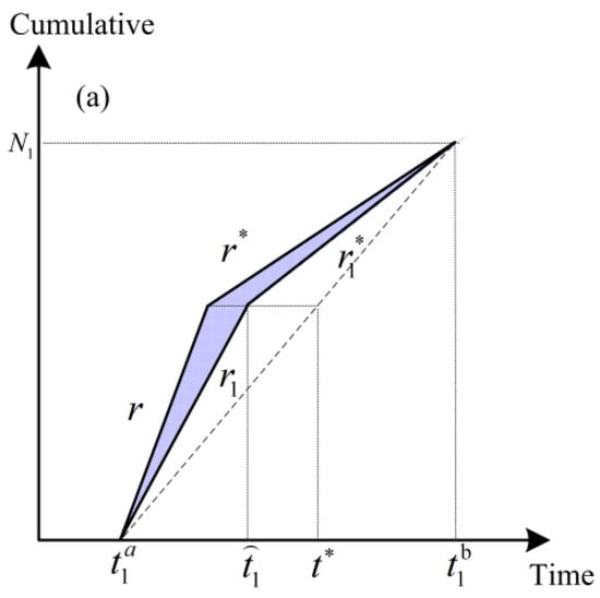 Considering Equations (16)–(19) and a comparison between Figure 5 and Figure 6, we can know that some behaviour under user equilibrium changes because RDs don’t need to consider the effect of punctual pickup time when commuters meet the case of bottleneck occurring after pickup point. The travel cost of SDs shows the characteristics of dynamic change in the transition process between single-peaked queue and double-peaked queue, and then converges to a fixed value, while the travel cost of RDs indicates different functions in a double-peaked case among different domains of ().