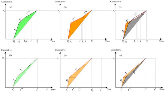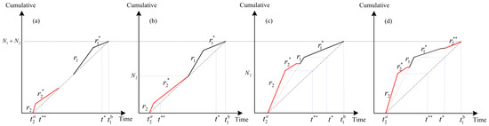 In this section, we will consider the different equilibrium traffic scenarios that may occur in reality with the formulations in Section 3.1 and Section 3.2. Depending on the pickup-work (PW) schedule gap, , there are two possible case that may arise at equilibrium. If is extremely smaller, there will be some ridesharing participants who arrive later than the desired work time no matter in Pre-PC or Post-PC scenario when morning commute system achieves equilibrium, which means RDs and RPs may depart from home in case 1, 2, and 4 under Pre-PC condition (the right side in Figure 3a–c), and in case 1 and 3 under Post-PC condition (the right side in Figure 4d–f), respectively. The same occurs as if is extremely larger, all ridesharing participants will arrive later than the desired work time, regardless of Pre-PC or Post-PC scenario when the morning commute system achieves equilibrium, which means RDs and RPs depart from home only in Case 1 and 2 under Pre-PC condition, which are shown as dotted part (left side) in Figure 3a–c and they may depart from home only in case 1 under Post-PC condition, which are shown as dotted part (left side) in Figure 4a–c.