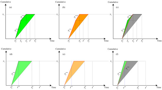 The departure patterns of ridesharing participants at equilibrium in Pre-PC scenario: (a) The departure rate of RDs in small punctual time gap for PW schedule; (b) The departure rate of RPs in small punctual time gap for PW schedule; (c) Mixed departure rate for RDs and RPs in small punctual time gap of PW schedule; (d) The departure rate of RDs in large punctual time gap for PW schedule; (e) The departure rate of RPs in large punctual time gap for PW schedule; (f) Mixed departure rate for RDs and RPs in large punctual time gap of PW schedule. (In Figure 3, , , is the equilibrium departure rate in Pre-PC scenario for RDs with three traffic pattern: early for pick up and work, early for pick up but late for work and late for pick up and work, respectively; Similarly, , , is the equilibrium departure rate in Pre-PC scenario for RPs with three traffic pattern: early for pick up and work, early for pick up but late for work and late for pick up and work, respectively).