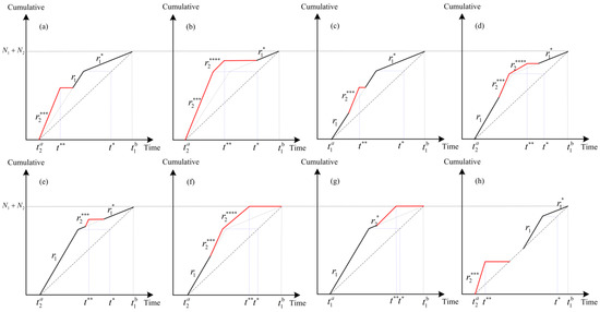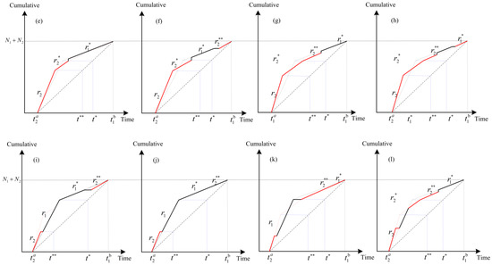 Figure 5a–h display the different DUE patterns of double-peaked queuing under Pre-PC, while Figure 5i–l delineate the different DUE pattern of single-peaked queuing under Pre-PC. By the way, considering ridesharing passenger waiting willingness, the cases in Figure 5d,f,h,I,k,l rarely happen in reality. Moreover, the optimal punctual time gap of system in Pre-PC and Post-PC are also displayed in Figure 5b and Figure 6a, respectively.