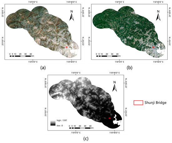 Images used for monitoring environmental factors in the Jinjiang River Basin. (a) Landsat 7 ETM+ image, (b) Sentinel-2 image, (c) ALOS DEM data.