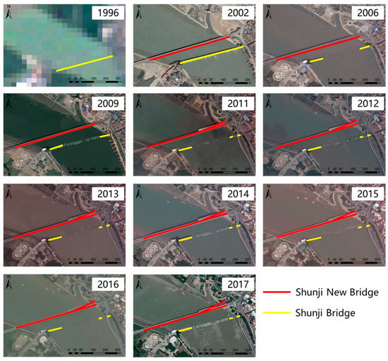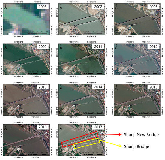 Similar to the Landsat 7 ETM+, the Landsat 5 TM sensor has 7 multispectral bands. The spatial resolution of the multispectral bands is 30 m, and the thermal infrared band has a spatial resolution of 60 m. Since the Landsat 5 TM image does not include the panchromatic band, multispectral images with a spatial resolution of 30 m were used directly, and the thermal infrared band was excluded. Twentieth-level Google Earth images from 2002 to 2017 with a spatial resolution of 0.27 m were selected for monitoring the Shunji Bridge and Shunji New Bridge. The time series images are shown in Figure 2.
