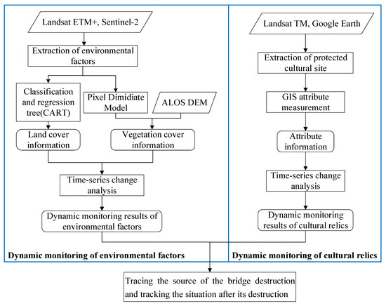 Therefore, this study carried out environmental factor monitoring and immovable cultural relic detection at both the macro- and microscales. In terms of environmental factor monitoring, remote sensing images with moderate spatial resolution were used to extract various environmental factors by the GEE platform. In terms of cultural relic monitoring, Google Earth time series images with a sub-meter spatial resolution were used to extract the attribute information to reflect the changes before and after destruction. A ruined immovable cultural relic, the Shunji Bridge, was studied in this paper. Quantitative assessment of the Shunji Bridge ranging from environmental factors at the macroscale to the protected cultural site at the microscale was performed. The whole process of the destruction of the bridge was traced, and the causes of its destruction were analysed. The findings can provide technical support for the risk assessment of and emergency response to natural disasters.