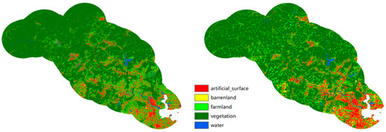 Five land cover classes were defined in the Jinjiang River Basin: artificial surface, barren land, farmland, vegetation and water. The characteristics of these land cover classes are listed in Table 3.