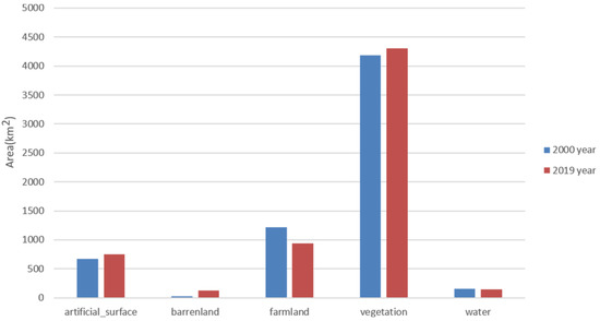 According to Figure 5, the area of the farmland class decreased by 271.95 km2 from 2000 to 2019, accounting for 4.35% of the total area. The areas of artificial surface, barren land and vegetation classes increased by 75.77 km2, 92.84 km2 and 120.18 km2, respectively. The increasing proportions were 1.21%, 1.48% and 1.92% for these three classes. The area of the water class barely changed.