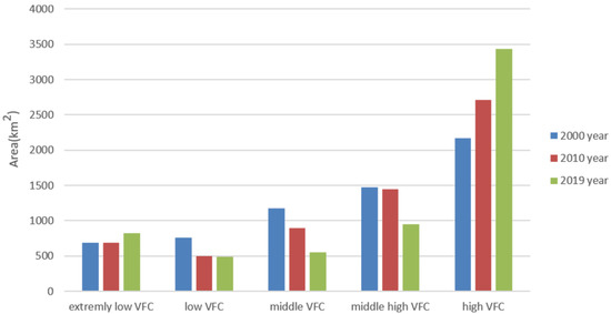 The area of each FVC grade was calculated for 2000, 2010 and 2019. The column chart of the areas of the FVC grades is shown in Figure 7 for the three years.