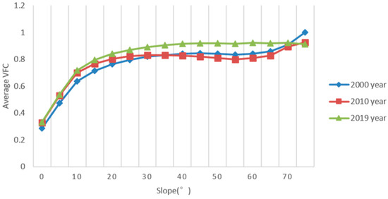 The changes in the FVC with slope in the Jinjiang River Basin for 2000, 2010, and 2019.