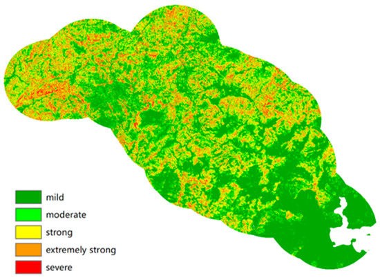 From the above results, it can be inferred that the collapse of the Shunji Bridge was partly related to the inhospitable environment of the Jinjiang River Basin. According to grades in Table 4, the spatial distribution of soil erosion intensity in the Jinjiang River Basin is produced in Figure 11.