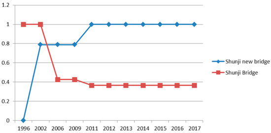 The varying area percentages of the Shunji Bridge and Shunji New Bridge were measured to obtain attribute information for these two bridges from the time series images. The spatial and temporal changes in the area percentages of the two bridges were extracted and analysed.