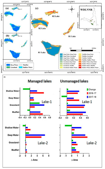 Habitat areas calculated from classified NDVI maps developed for 2016–2017 (a) and 2017–2018 (b) wintering periods were analyzed to detect change or conversion of one habitat type to another in each study lake (c). (d) change in habitat areas plotted for each study lake during study duration.