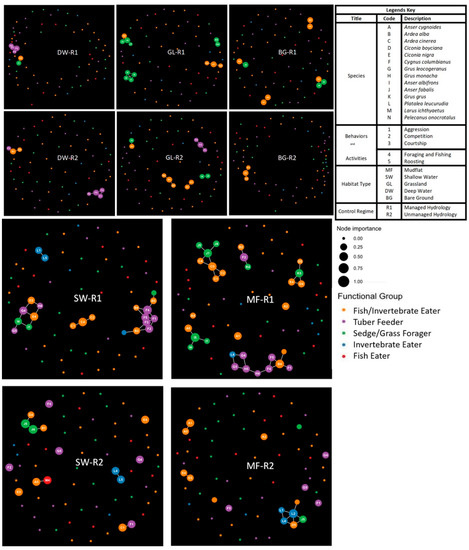 MSGs represent a non-trophic social behavioral association network (SBAN) in varying environments [8]. Investigations of species association networks in varying environmental gradients are rare in animal MSGs, especially in migratory waterbirds. An important aspect of these species associations is how similar the networks are that they form in different environmental or land-uses conditions [27,28]. Recent application of network analysis to analyze species associations in MSGs offers evaluations for habitat suitability and habitat quality [8,13,19,29,30,31,32,33]. Behavioral network analysis: (1) allows comparisons of the habitat quality of targeted and reference sites that have fitness consequences for organisms [8,34,35]; (2) provides invaluable information about reasons for differences in species behavioral network structures [16,36]; (3) identifies critical resources (food and roosting sites) that make a site suitable or not through species-habitat associations [37]; and (4) provides information on the mechanisms through which species contribute to ecosystem functioning [18,21,38,39].
