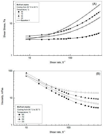 - The reported rheogram profiles of the jojoba biofuel with respect to shear rate versus shear stress rises substantially in a slightly nonlinear manner on a logarithmic scale.