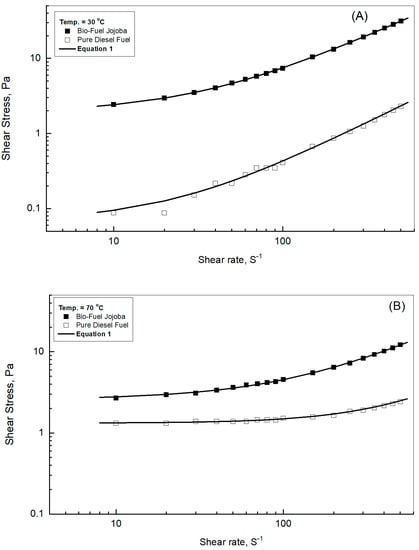 - The rheogram profiles of the jojoba oil biofuel are located well above the diesel profiles at both 30 °C and 70 °C.