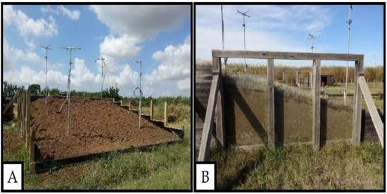 The preliminary step consisted of completely weeding the experimental hill. Ten days after, the half parcel (Figure 2A) was covered with a mulch cloth. In this way, the land would have not been irrigated, it would have been protected against wind and rainfall erosion, and the spontaneous vegetation growth would have been prevented.