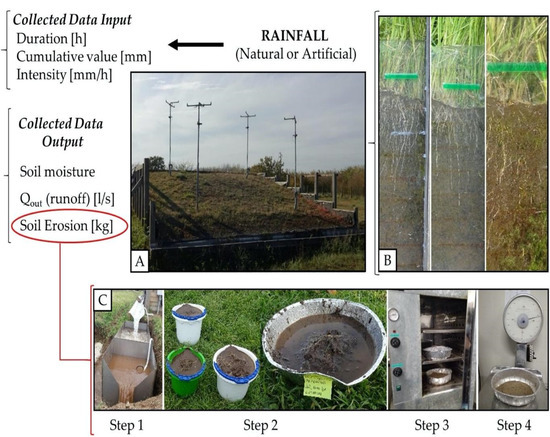 Description of data collection. (A) View of the experimental plot. (B) Detail of root growth monitoring. (C) Description of soil erosion measurements: Step 1: The tank for sedimentation of eroded material; Step 2: The eroded material; Step 3: Detail of drying in the oven at 110 °C for 24 h; Step 4: Final weighing of eroded material.