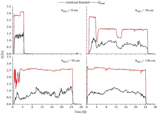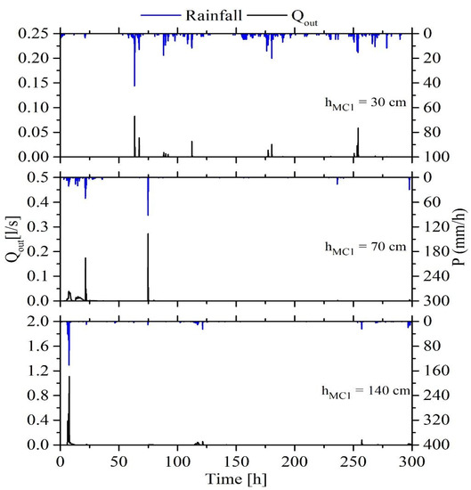 First, the natural rainfall condition has been analyzed. Figure 4 represents the input (natural rainfall) and output (runoff) time series that occurred in the different conditions of vegetation height. Considering the cumulative values for rainfall and runoff, the detected runoff coefficients were 0.05 (hMC1 = 30 cm), 0.46 (hMC1 = 70 cm), and 0.92 (hMC1 = 140 cm). From a theoretical point of view, we were expecting a lower runoff coefficient value for the increasing vegetation height. The obtained results could be due to the high values of soil moisture that were recorded in all the tests, and above all to the different rainfall intensities that occurred during the “natural” tests. Indeed, unfortunately a higher intensity was registered with a higher vegetation, and therefore, probably, mitigating the MC1 efficiency.