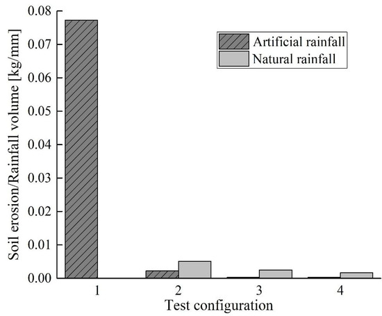 Figure 7 shows the ratio between the eroded soil amount and the rainfall volume observed in the four tests. It is noteworthy that, in the artificial rainfall conditions, the test in the bare soil configuration (test no. 1) was interrupted after 4 h of rainfall due to the massive soil erosion (Table 1). Figure 7 clearly shows that the eroded soil material for the configuration of bare soil is impressively higher than the corresponding values obtained using “vegetated” configurations. In particular, from test no. 1 to 3 a soil erosion reduction (normalized on rainfall height) of about 300 times has been obtained, similar to the reduction observed for test no. 4. These data confirm that the vegetation efficiency can be considered as maximum at hMC1 = 70 cm. Indeed, with hMC1 = 30 cm, we obtained a reduction in soil erosion, with respect to the bare soil, of about 35 times.